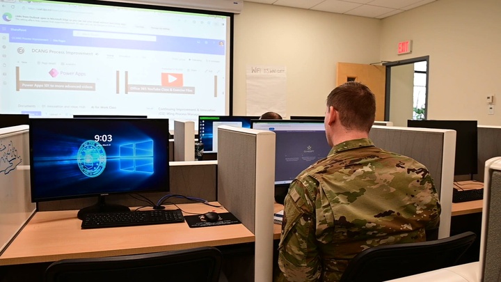 JOINT BASE ANDREWS, Md. -- Brian Mongold, Continuous Improvement and Innovation manager, teaches Airmen about using artificial intelligence tools, including NIPRGpt, at Joint Base Andrews, Md., March 21, 2025. This class is the first in a series designed to educate service members and optimize their time and productivity.